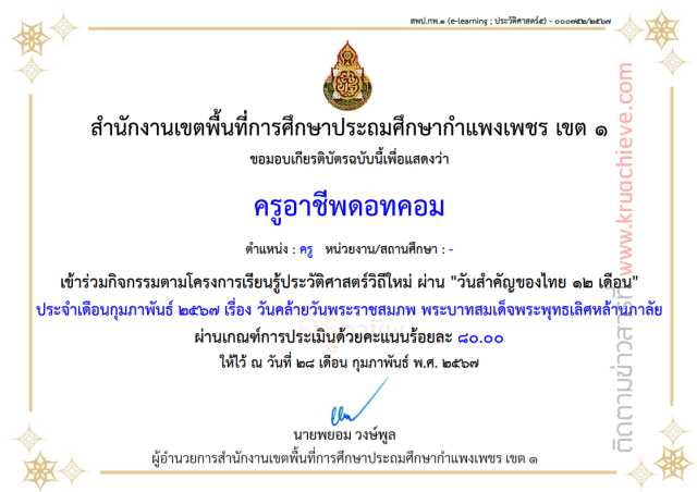 แบบทดสอบออนไลน์ เรื่อง วันคล้ายวันพระราชสมภพ พระบาทสมเด็จพระพุทธเลิศหล้านภาลัย ผ่านเกณฑ์ ร้อยละ ๘๐ จะได้รับเกียรติบัตรทันทีทางอีเมล โดยสพป.กำแพงเพชร เขต ๑