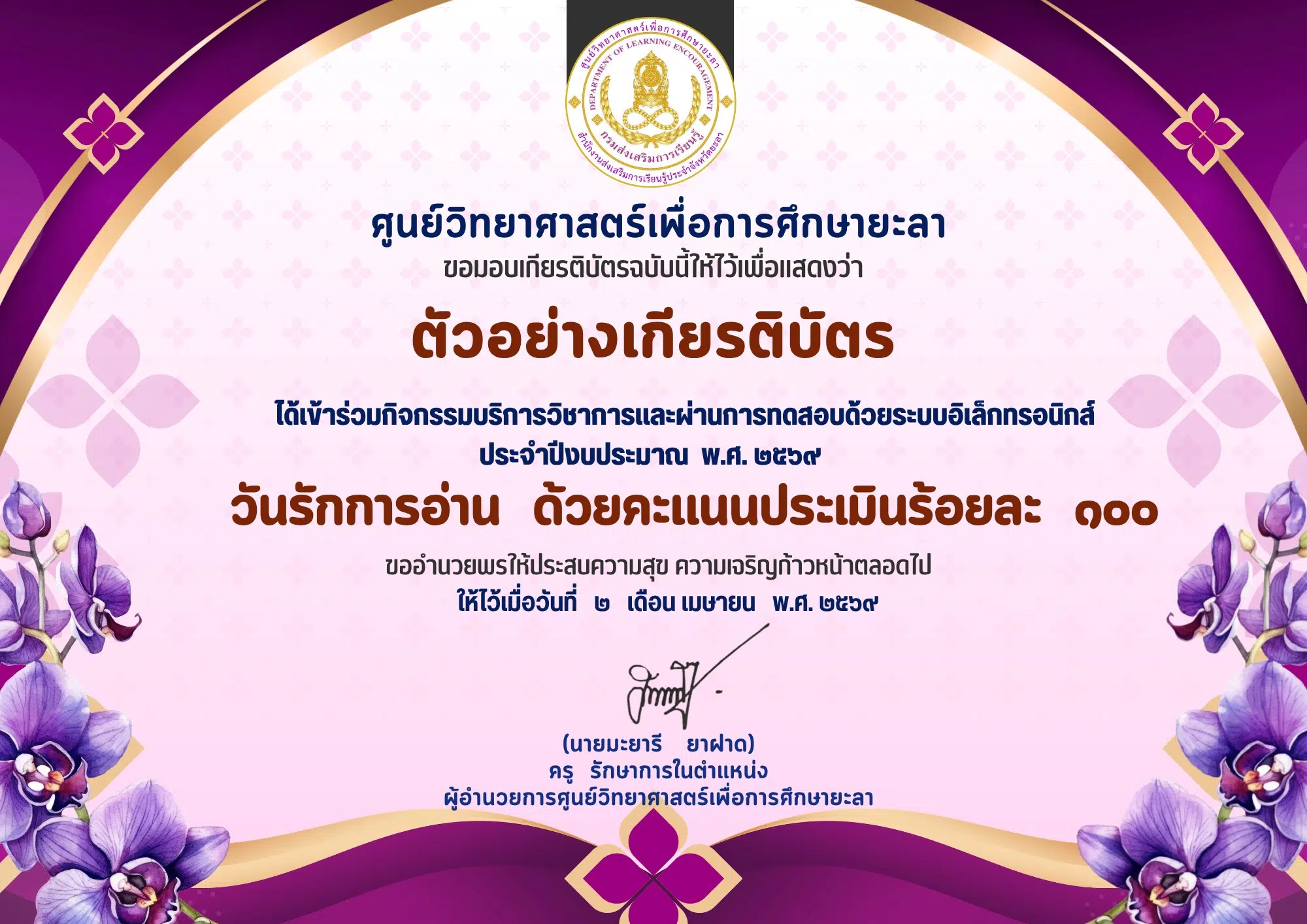 แบบทดสอบออนไลน์ เรื่อง วันรักการอ่าน ผ่านเกณฑ์ 60% รับเกียรติบัตรทางอีเมล โดยศูนย์วิทยาศาสตร์เพื่อการศึกษายะลา