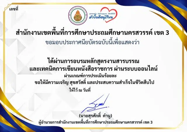 แบบทดสอบออนไลน์ เรื่อง งานสารบรรณ และเทคนิคการเขียนหนังสือราชการ ผ่านเกณฑ์ 80% รับเกียรติบัตร โดย สพป.นครสวรรค์ เขต 3