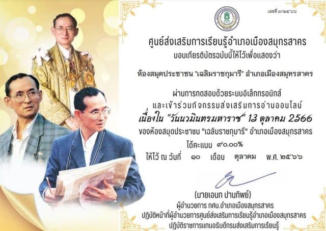 แบบทดสอบ เรื่อง “โครงการในพระราชดำริ” เนื่องในโอกาส “วันนวมินทรมหาราช” 13 ตุลาคม 2566 ผ่านเกณฑ์ 60% รับเกียรติบัตร โดย สกร. อำเภอเมืองสมุทรสาคร