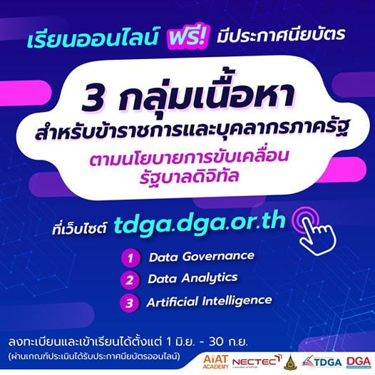 สำนักงานพัฒนารัฐบาลดิจิทัล เปิดให้ข้าราชการและบุคลากรภาครัฐ อบรมออนไลน์ฟรี 3 กลุเมเนื้อหาผ่านเว็บไซต์ https://tdga.dga.or.th/