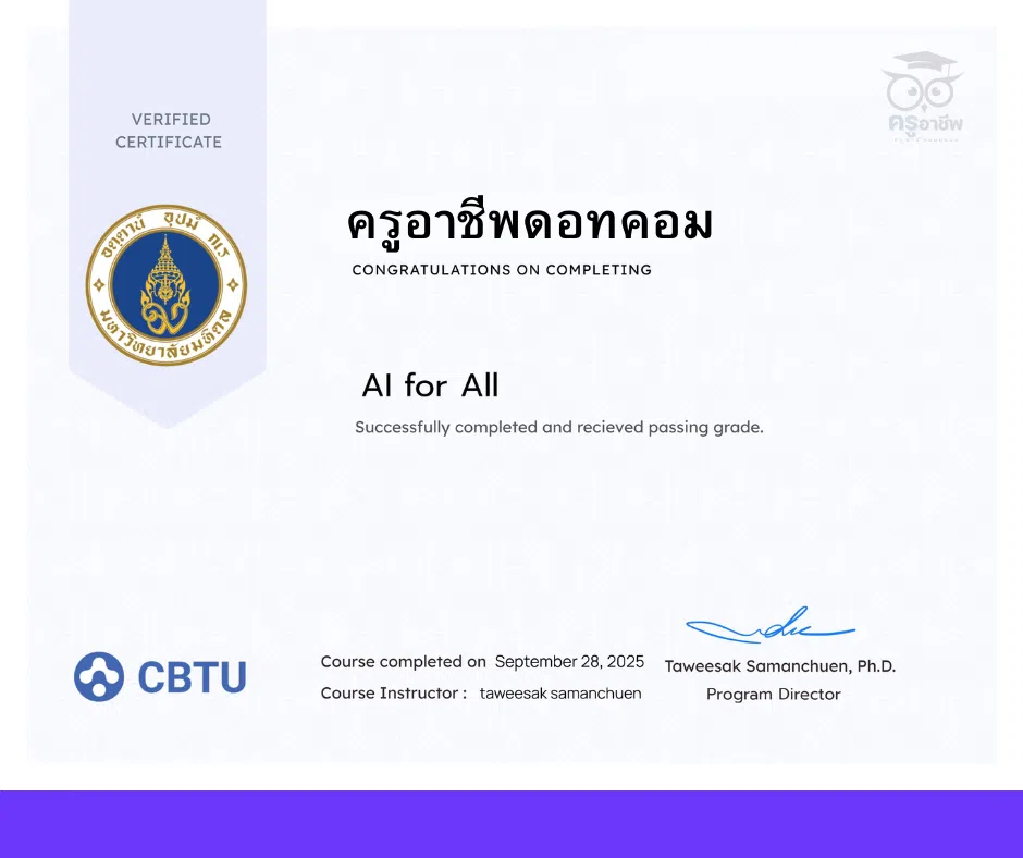 คอร์สเรียนฟรีมาแล้วจ้าาา! ใครอยากอัปสกิล รีบเข้าไปเลย 👉 https://cbtumu.net ตอนนี้มีคอร์สฟรีให้เรียนเพียบ ทั้ง 🤖 AI 🧠 Prompt Engineering 📚 และคอร์สใหม่ ๆ ที่กำลังจะตามมาอีกเพียบ! เรียนจบแล้วได้ ใบประกาศนียบัตร ด้วยนะ ✔️ มี Barcode ตรวจสอบได้จริง ✔️ ใช้ยื่นสมัครงานได้เลย ใบประกาศนียบัตร​ หลังผ่านการอบรมมีใบประกาศนียบัตรให้ทุกหลักสูตร และสามารถยื่นขอรับรองสมรรถนะเพิ่มเติมได้ในหลักสูตรที่ได้รับการรับจากสถาบันคุณวุฒิวิชาชีพแห่งชาติ (TPQI)