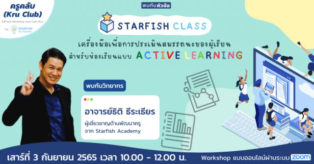 อบรมออนไลน์ฟรี หลักสูตร Starfish Class เครื่องมือเพื่อการประเมินสมรรถนะของผู้เรียน สำหรับห้องเรียนแบบ Active learning วันที่ 3 กันยายน 2565 โดย Starfish Labz