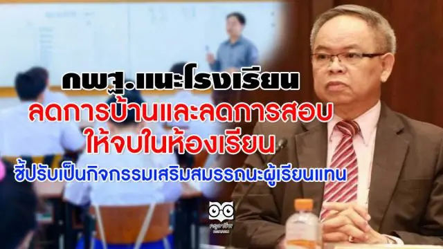 กพฐ.แนะโรงเรียน ลดการบ้านและลดการสอบ จบในห้องเรียน ชี้ปรับเป็นกิจกรรมเสริมสมรรถนะผู้เรียนแทน ประธานกพฐ.ถก สานต่อนโยบาย “ณัฏฐพล” ลดการบ้านและลดการสอบวัดประเมินผลต่างๆของนักเรียน ในสถานการณ์โควิด ชี้ โรงเรียนควรปรับเป็นกิจกรรมเสริมสมรรถนะผู้เรียน