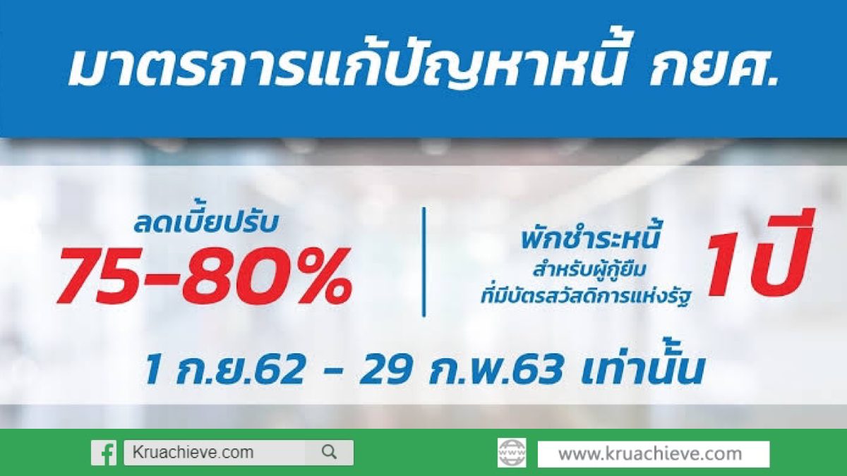 ลดเบี้ยปรับในอัตราร้อยละ 80 สำหรับผู้กู้ยืมเงินทุกกลุ่มที่ค้างชำระหนี้และปิดบัญชีในครั้งเดียว