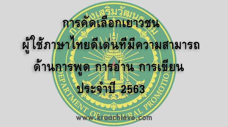 กรมส่งเสริมวัฒนธรรม กระทรวงวัฒนธรรม ดำเนินการคัดเลือกเยาวชนผู้ใช้ภาษาไทยดีเด่นที่มีความสามารถด้านการพูด การอ่าน การเขียน พุทธศักราช 2563 โดยมีวัตถุประสงค์เพื่อเป็นแรงบันดาลใจให้เยาวชนรักภาษาไทยและสามารถใช้ภาษาไทยได้อย่างถูกต้องเหมาะสมและคัดเลือกเป็นเยาวชนผู้ใช้ภาษาไทยดีเด่นที่มีความสามารถด้านการพูด การอ่าน การเขียน พุทธศักราช 2563 รายละเอียดดังแนบ