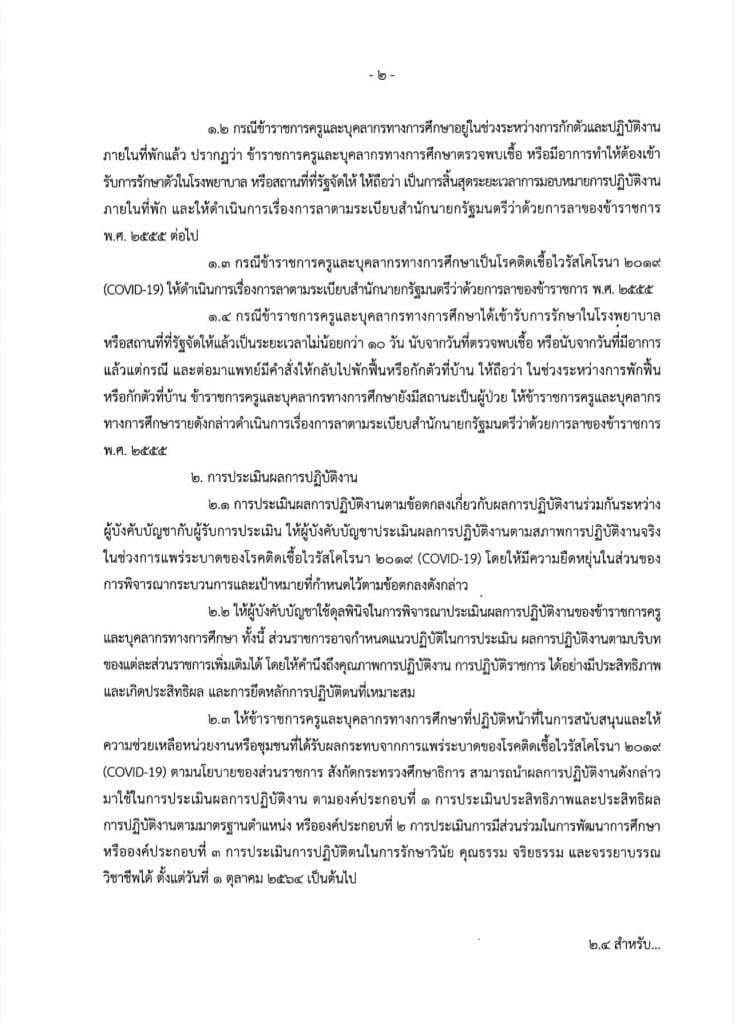 ๒.๓ ให้ข้าราชการครูและบุคลากรทางการศึกษาที่ปฏิบัติหน้าที่ในการสนับสนุนและให้ ความช่วยเหลือหน่วยงานหรือชุมชนที่ได้รับผลกระทบจากการแพร่ระบาดของโรคติดเชื้อไวรัสโคโรนา ๒๐๑๙ (COVID-19) ตามนโยบายของส่วนราชการ สังกัดกระทรวงศึกษาธิการ สามารถนําผลการปฏิบัติงานดังกล่าว มาใช้ในการประเมินผลการปฏิบัติงาน ตามองค์ประกอบที่ ๑ การประเมินประสิทธิภาพและประสิทธิผล การปฏิบัติงานตามมาตรฐานตําแหน่ง หรือองค์ประกอบที่ ๒ การประเมินการมีส่วนร่วมในการพัฒนาการศึกษา หรือองค์ประกอบที่ ๓ การประเมินการปฏิบัติตนในการรักษาวินัย คุณธรรม จริยธรรม และจรรยาบรรณ วิชาชีพได้ ตั้งแต่วันที่ ๑ ตุลาคม ๒๕๖๔ เป็นต้นไป
