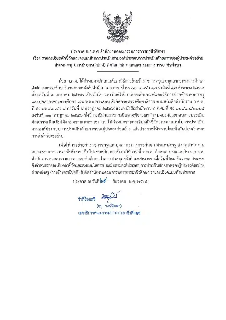 ตามหนังสือที่อ้างถึง ก.ค.ศ. ได้กำหนดหลักเกณฑ์และวิธีการย้ายข้าราชการครูและบุคลากรทางการศึกษา ตำแหน่งครู สังกัดกระทรวงศึกษาธิการ โดยให้สำนักงานคณะกรรมการการอาชีวศึกษากำหนดปฏิทินการย้าย และรายละเอียดตัวชี้วัดและคะแนนตามองค์ประกอบการประเมินศักยภาพของผู้ประสงค์ขอย้ายตำแหน่งครู สังกัดสำนักงานคณะกรรมการการอาชีวศึกษา ที่ ก.ค.ศ. กำหนด ความแจ้งแล้วนั้น
