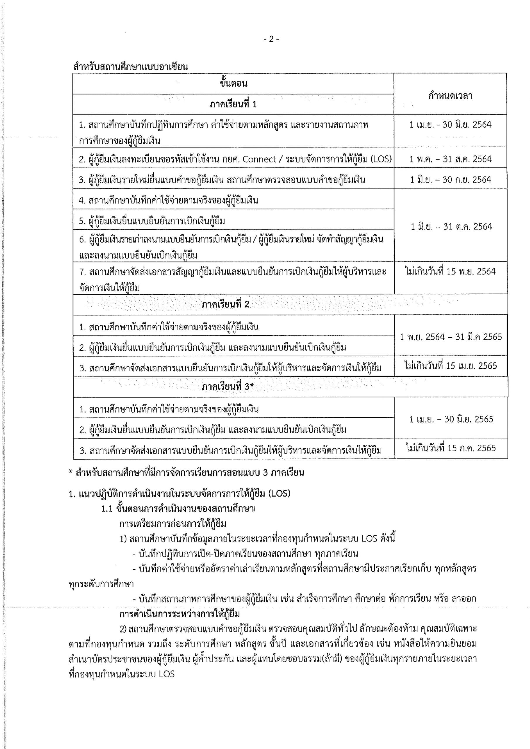 โดยที่เป็นการสมควรกําหนดระยะเวลาดําเนินการให้กู้ยืมเงิน กองทุนเงินให้กู้ยืมเพื่อการศึกษา ประจําปีการศึกษา 2564 รวมถึงแนวปฏิบัติการดําเนินงานในระบบจัดการการให้กู้ยืม (LOS) และแนวปฏิบัติการส่ง เอกสารสัญญาให้ผู้บริหารและจัดการเงินให้กู้ยืม คณะกรรมการ กองทุนเงินให้กู้ยืมเพื่อการศึกษา ในการประชุมครั้งที่ 12/2563 เมื่อวันที่ 18 ธันวาคม 2563 ได้มีมติเห็นชอบกําหนดการ ให้กู้ยืมเงิน กองทุนเงินให้กู้ยืมเพื่อการศึกษา ประจําปีการศึกษา 2564 กองทุนจึงแจ้งกําหนดการให้กู้ยืมเงินสําหรับปีการศึกษา 2564 ดังนี้