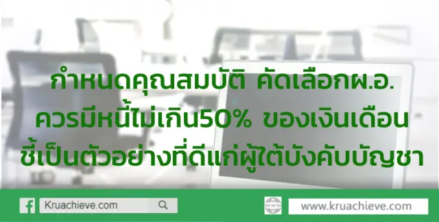 กำหนดคุณสมบัติ คัดเลือกผู้บริหารสถานศึกษา ควรมีหนี้ไม่เกิน50% ของเงินเดือน ชี้เป็นตัวอย่างที่ดีแก่ผู้ใต้บังคับบัญชา เตรียม ใช้ “หนี้สิน”เป็นตัวกำหนดคุณสมบัติ คัดเลือก ผู้บริหารสถานศึกษา ทั้ง ผอ. รองผอ.รร.และกลุ่มสพท. ต้องมีหนี้ไม่เกิน50% ของเงินเดือน ชี้ปัญหาหนี้ สะท้อนว่าบริหารจัดการตัวเอง ได้ดีแค่ไหน ก่อนไปบริหารจัดการโรงเรียน เล็งใช้”สัดส่วนหนี้”เป็นเกณฑ์คัดเลือกผอ.รร ลั่นเพื่อสะท้อนคุณภาพบริหารจัดการชีวิตตัวเอง ก่อนไปเป็นผู้บริหารสถาบัน