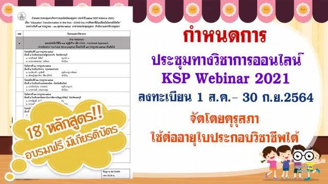 กําหนดการ ประชุมทางวิชา การออนไลน์ของคุรุสภา ประจําปี ๒๕๖๔ (KSP Webinar 2021) เรื่อง “Education Transformation in the Post – COVID Era: การศึกษาที่ผันเปลี่ยนในโลกหลังโควิด” ระหว่างวันที่ ๑๕ กรกฎาคม – ๓๑ ตุลาคม ๒๕๖๔ อาคารหอประชุมคุรุสภา สํานักงานเลขาธิการคุรุสภา
