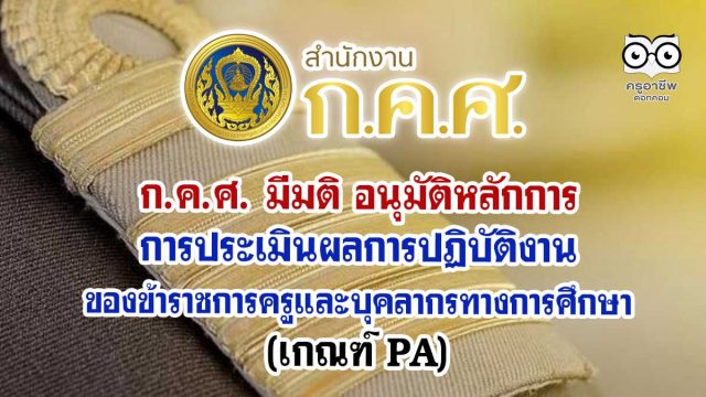 ก.ค.ศ. มีมติ อนุมัติ หลักการการประเมินผลการปฏิบัติงานของข้าราชการครูและบุคลากรทางการศึกษา (เกณฑ์ PA) ลดความซ้ำซ้อนจากการประเมิน เน้นระบบการประเมินแบบ Performance-based Appraisal และ ข้าราชการครูและบุคลากรทางการศึกษาทุกคน ต้องทำ PA กับผู้บริหาร (ยกเว้นครูผู้ช่วย)