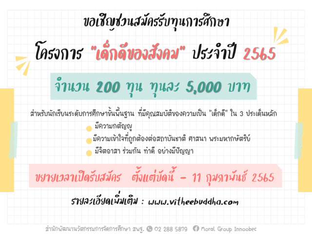 ขอเชิญชวนสมัครรับทุนการศึกษาโครงการ “เด็กดีของสังคม” ประจำปี ๒๕๖๕ ขยายเวลาจนถึง ๑๑ กุมภาพันธ์ ๒๕๖๕