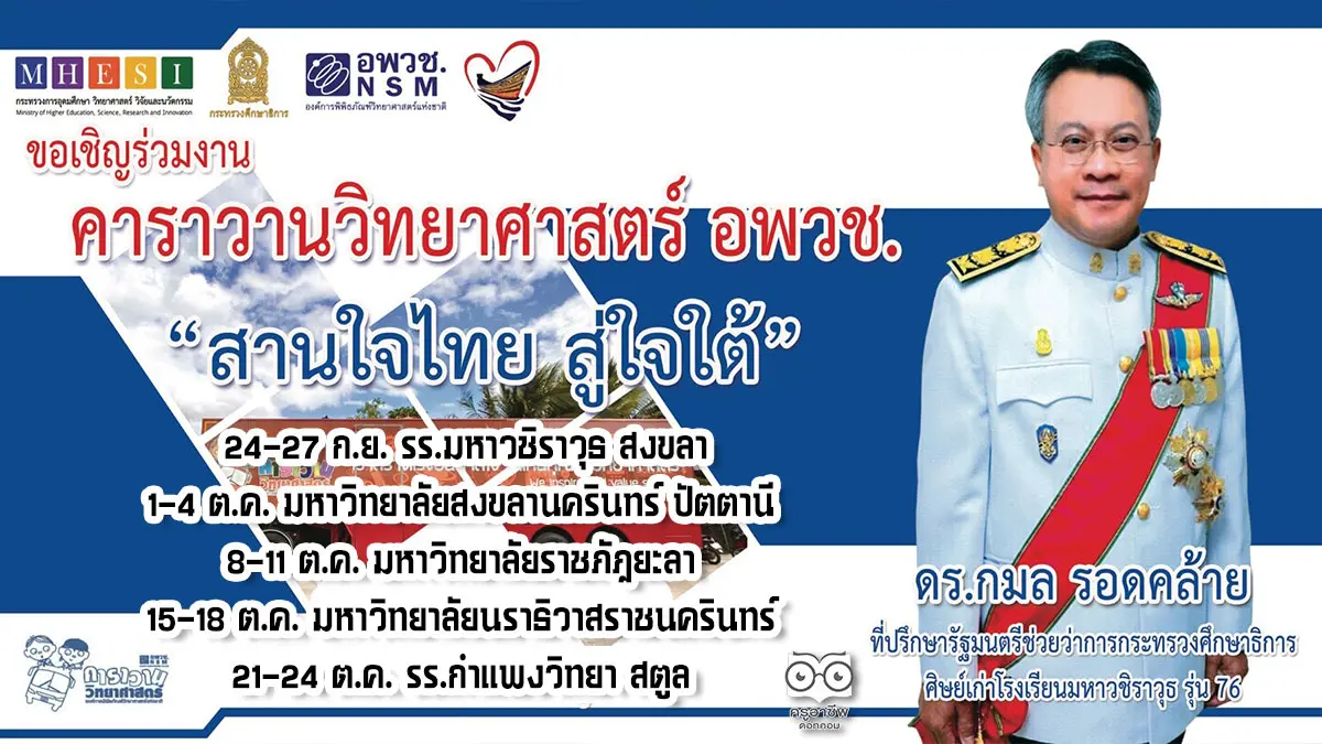 ขอเชิญร่วมงาน คาราวานวิทยาศาสตร์ อพวช. “สานใจไทย สู่ใจใต้” ในพื้นที่ภาคใต้ ที่ปรึกษา รมช.ศธ. ‘กมล รอดคล้าย’ และศิษย์เก่า รร.มหาวชิราวุธ สงขลา ฝากประชาสัมพันธ์งานใหญ่ “คาราวานวิทยาศาสตร์ อพวช.” ในพื้นที่ภาคใต้ และภาคใต้ชายแดน