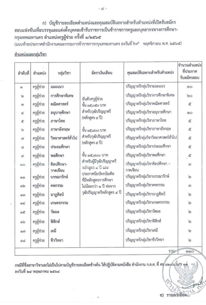 ประกาศสำนักงานคณะกรรมการข้าราชการกรุงเทพมหานคร เรื่อง รับสมัครสอบแข่งขันเพื่อบรรจุและแต่งตั้งบุคคลเข้ารับราชการเป็นข้าราชการครู และบุคลากรทางการศึกษากรุงเทพมหานคร ตำแหน่งครูผู้ช่วย ครั้งที่ ๑/๒๕๖๕ เปิดสอบครูผู้ช่วย สังกัด กทม. จำนวน 18 สาขาวิชา 110 อัตรา รับสมัครทางอินเทอร์เน็ต ตั้งแต่วันที่ 6 -13 ธันวาคม 2565 ตลอด 24 ชั่วโมง (ไม่เว้นวันหยุดราชการ)