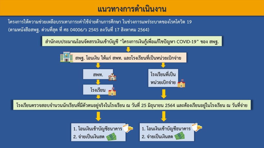 แนวทางการดำเนินงานการช่วยเหลือค่าใช้จ่ายผู้ปกครองและนักเรียน สังกัดสำนักงานคณะกรรมการการศึกษาขั้นพื้นฐาน ในช่วงการแพร่ระบาดของโรคติดเชื้อโควิด –19 (เพื่อลดภาระให้แก่ผู้ปกครองในอัตรา 2,000 บาทต่อนักเรียน 1 คน) เอกสารประกอบการประชุม วันที่ 27 สิงหาคม 2564
