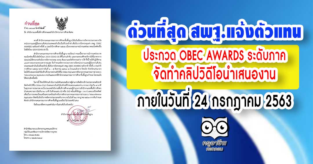 ด่วนที่สุด สพฐ.แจ้งตัวแทน ประกวด OBEC AWARDS ระดับภาค จัดทําคลิปวิดีโอนําเสนองาน ภายในวันที่ 24 กรกฎาคม 2563