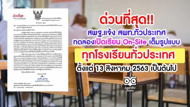 ด่วนที่สุด!! สพฐ.แจ้ง สพท.ทั่วประเทศ ให้สถานศึกษาทุกแห่งทดลองเปิดเรียน On-Site เต็มรูปแบบ ทุกโรงเรียนทั่วประเทศ ตั้งแต่ 13 สิงหาคม 2563 เป็นต้นไป