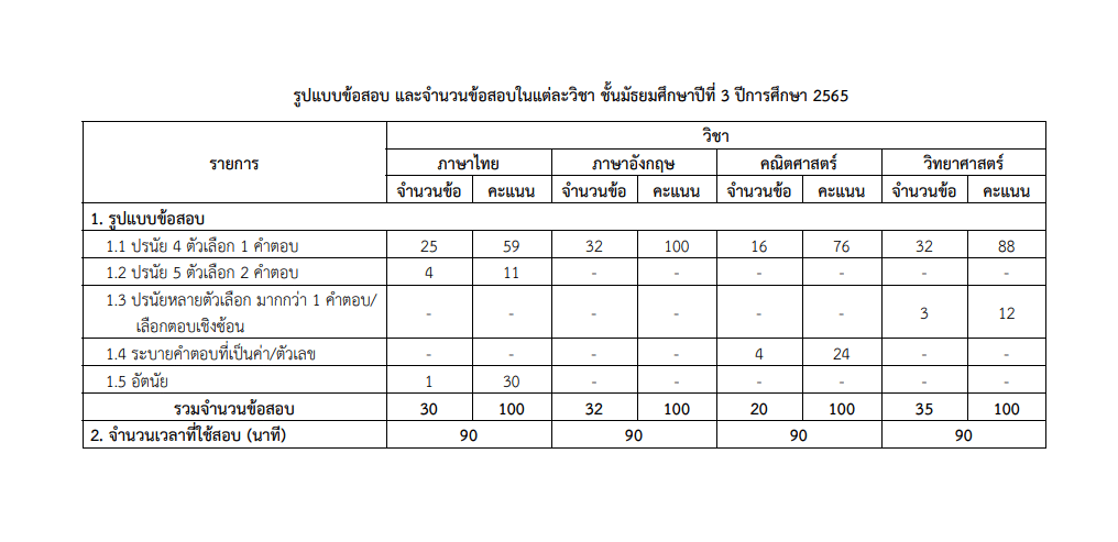 - รูปแบบข้อสอบ และจำนวนข้อสอบในแต่ละรายวิชา (Test Blueprint)