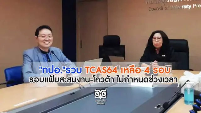“ทปอ.”รวบ TCAS64 เหลือ 4 รอบ รอบแฟ้มสะสมงาน-โควต้า ไม่กำหนดช่วงเวลา สรุปประเด็นเปลี่ยนแปลง TCAS64 พร้อมกำหนดการฉบับ official จากทปอ. จัดโดยที่ประชุมอธิการบดีแห่งประเทศไทย 4 ส.ค. 63 สรุปประเด็นสำคัญดังนี้