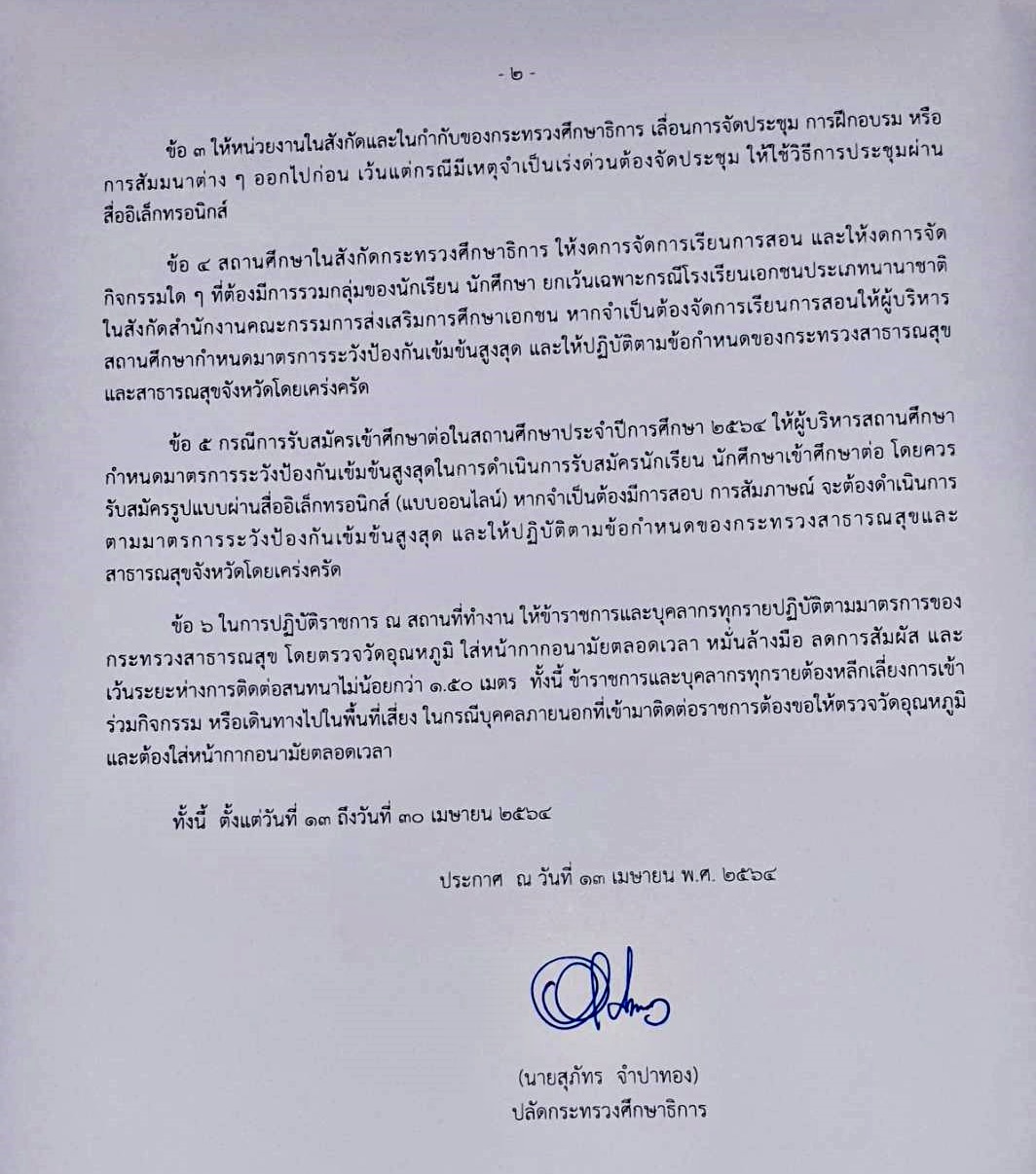 ข้อ 4 สถานศึกษาในสังกัดกระทรวงศึกษาธิการ ให้งดการจัดการเรียนการสอน และให้งดการจัดกิจกรรมใด ๆ ที่ต้องมีการรวมกลุ่มของนักเรียน นักศึกษา ยกเว้นเฉพาะกรณีโรงเรียนเอกชนประเภทนานาชาติ ในสังกัดสำนักงานคณะกรรมการส่งเสริมการศึกษาเอกชน หากจำเป็นต้องจัดการเรียนการสอน ให้ผู้บริหารสถานศึกษากำหนดมาตรการระวังป้องกันเข้มข้นสูงสุด และให้ปฏิบัติตามข้อกำหนดของกระทรวงสาธารณสุข และสาธารณสุขจังหวัดโดยเคร่งครัด