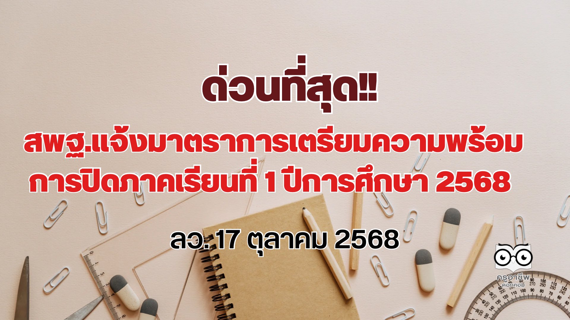ด่วนที่สุด มาตราการเตรียมความพร้อมการปิดภาคเรียนที่ 1 ปีการศึกษา 2568 ลว. 17 ตุลาคม 2568 หนังสือ “ด่วนที่สุด” สำนักงานคณะกรรมการการศึกษาขั้นพื้นฐาน ที่ ศธ 04001/ว46484 ลว. 17 ตุลาคม 2568 เรื่อง มาตราการเตรียมความพร้อมการปิดภาคเรียนที่ 1 ปีการศึกษา 2568