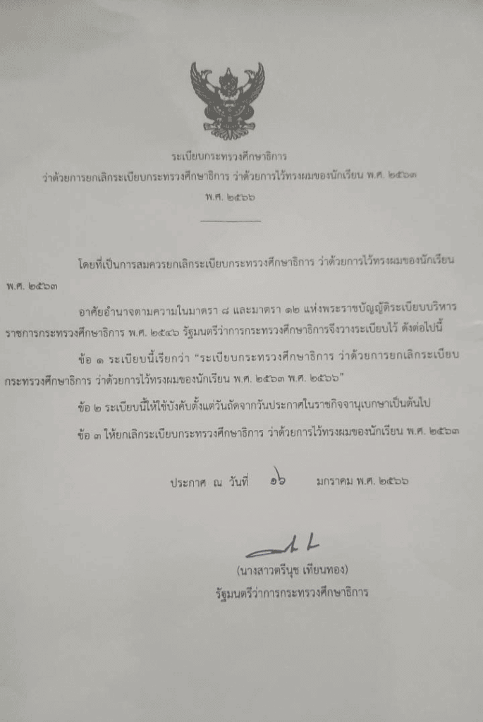 ดังนั้น เมื่อวันที่ 16 มกราคมที่ผ่านมา ตนจึงได้ลงนามในระเบียบ ศธ.ว่าด้วยการยกเลิกระเบียบ ศธ.ว่าด้วยการไว้ทรงผมของนักเรียน พ.ศ.2563