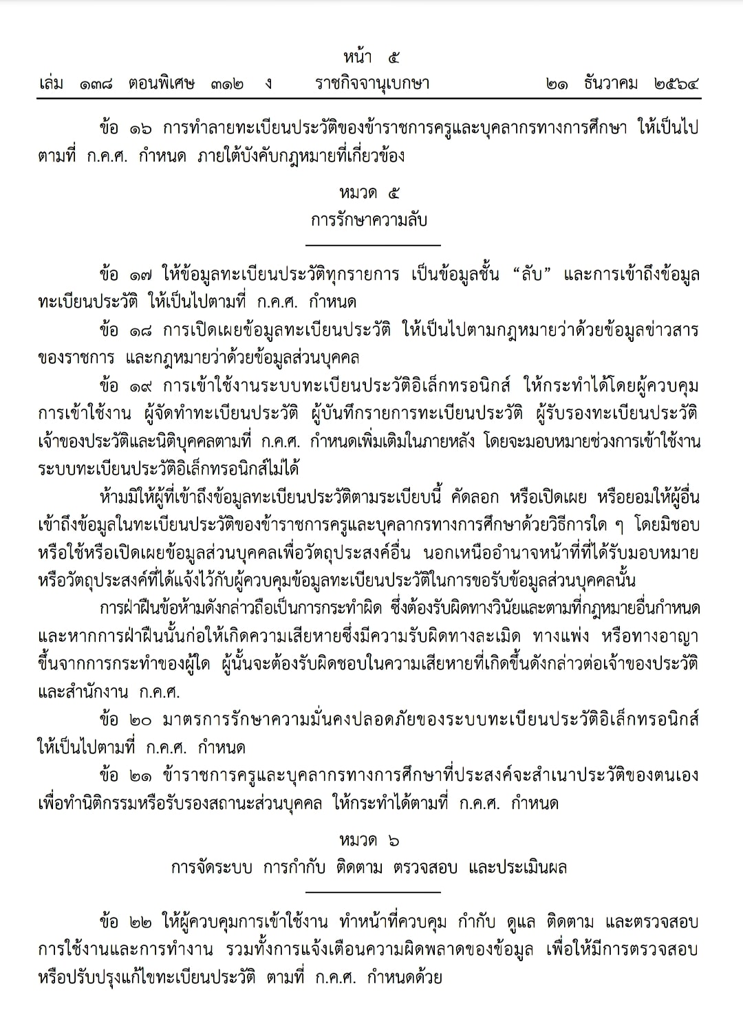 ราชกิจจานุเบกษา เมื่อวันที่ 21 ธันวาคม 2564 เผยแพร่ระเบียบ ก.ค.ศ. ว่าด้วยระบบทะเบียนประวัติข้าราชการครูและบุคลากรทางการศึกษาอิเล็กทรอนิกส์ พ.ศ. 2564 ลงนามโดยนางสาวตรีนุช เทียนทอง รัฐมนตรีว่าการกระทรวงศึกษาธิการ ในฐานะประธาน ก.ค.ศ.