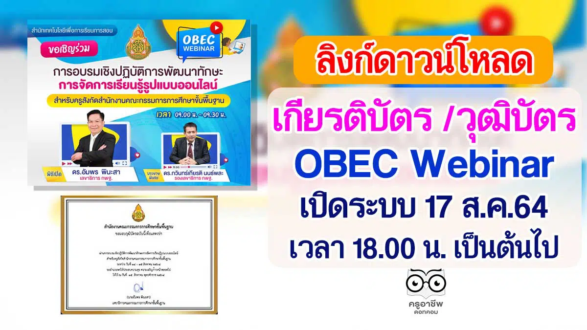 ลิงก์ดาวน์โหลดเกียรติบัตร วุฒิบัตร OBEC Webinar เปิดระบบ 17 ส.ค.64 เวลา 18.00 น. เป็นต้นไป