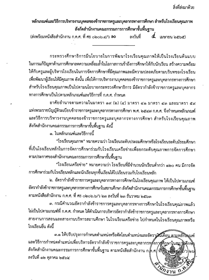 เมื่อวันที่ 5 เมษายน 2565 สำนักงาน ก.ค.ศ. ได้เผยแพร่หนังสือเวียน ว 10/2565 หลักเกณฑ์และวิธีการบริหารงานบุคคลของข้าราชการครูและบุคลากรทางการศึกษา สำหรับโรงเรียนคุณภาพ สังกัดสำนักงานคณะกรรมการการศึกษาขั้นพื้นฐาน โดยมีเนื้ิอหาสรุปดังนี้