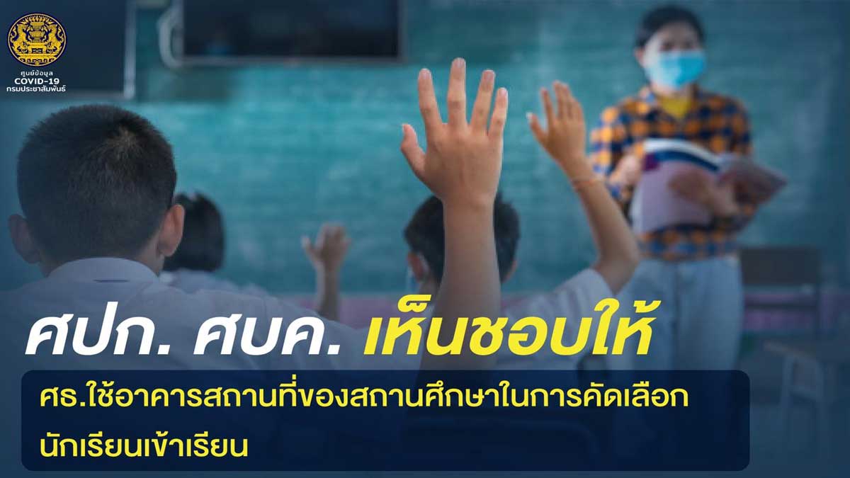 ศปก. ศบค. เห็นชอบให้ ศธ.ใช้อาคารสถานที่ของสถานศึกษาในการคัดเลือกนักเรียนเข้าเรียนระดับประถมศึกษาปีที่ 1 ระดับชั้นมัธยมศึกษาปีที่ 1 และปีที่ 4 ขอให้ปฏิบัติตามมาตรการ ศบค. กำหนดรวมทั้งมาตรการของจังหวัดในพื้นที่