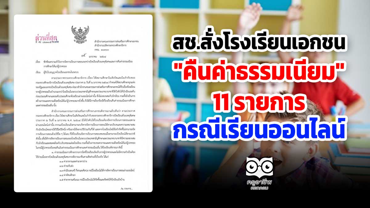 สช.สั่งโรงเรียนเอกชน “คืนค่าธรรมเนียม” 11 รายการ กรณีเรียนออนไลน์ บรรเทาภาระและความเดือดร้อนให้แก่ผู้ปกครอง