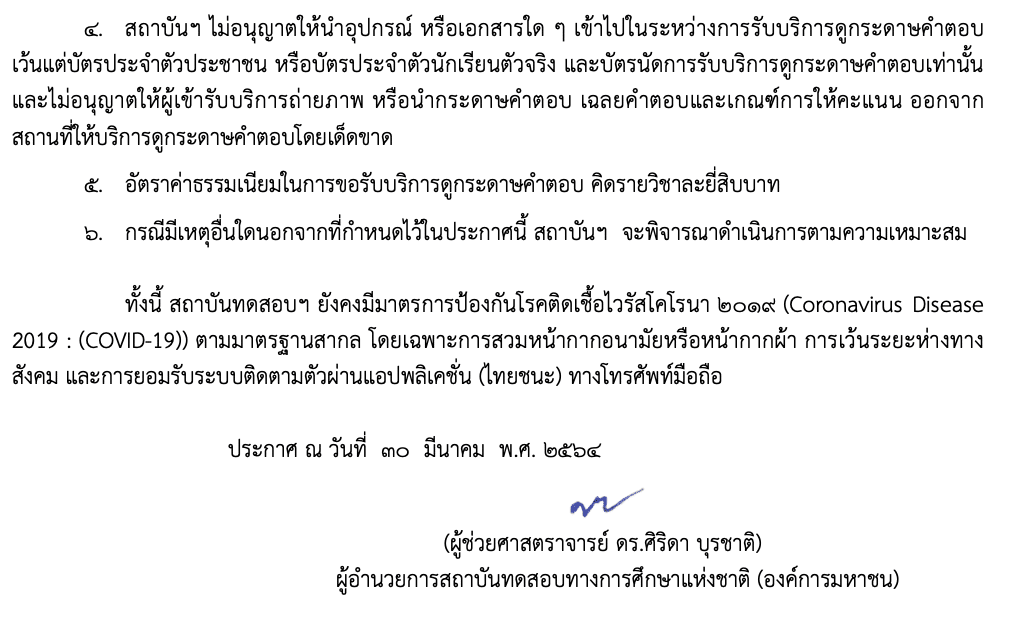 การให้บริการดู-ผู้เข้ารับบริการจะได้ดูกระดาษคำตอบของตนเอง เฉลยคำตอบ และเกณฑ์การให้คะแนนของแต่ละวิชาเท่านั้น