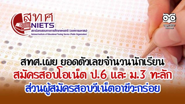 สทศ.เผย ยอดตัวเลขจำนวนนักเรียนสมัคสอบโอเน็ต ป.6 และ ม.3 ทะลัก โดย ป.6 จำนวนผู้สมัคร 548,345 คน และ ม.3 จำนวนผู้สมัคร 400,496 คน ส่วนผู้สมัครสอบวีเน็ตอาชีวะกร่อย