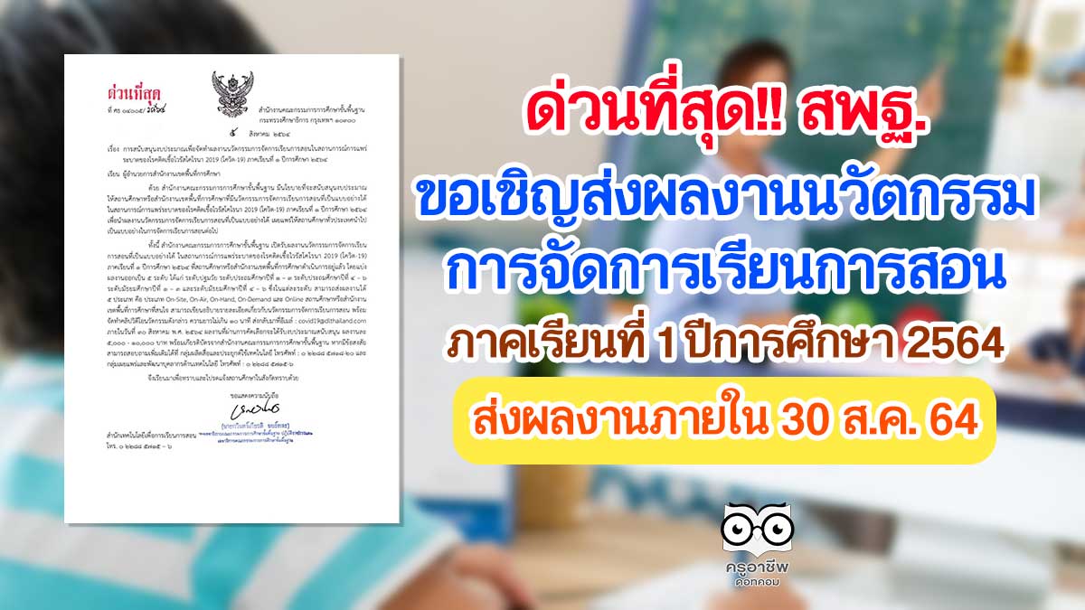 สพฐ.ขอเชิญส่งผลงานนวัตกรรมการจัดการเรียนการสอน ภาคเรียนที่ 1 ปีการศึกษา 2564 รับเงินสนับสนุน และเกียรติบัตรจาก สพฐ. ส่งผลงานภายในวันที่ 30 สิงหาคม 2564