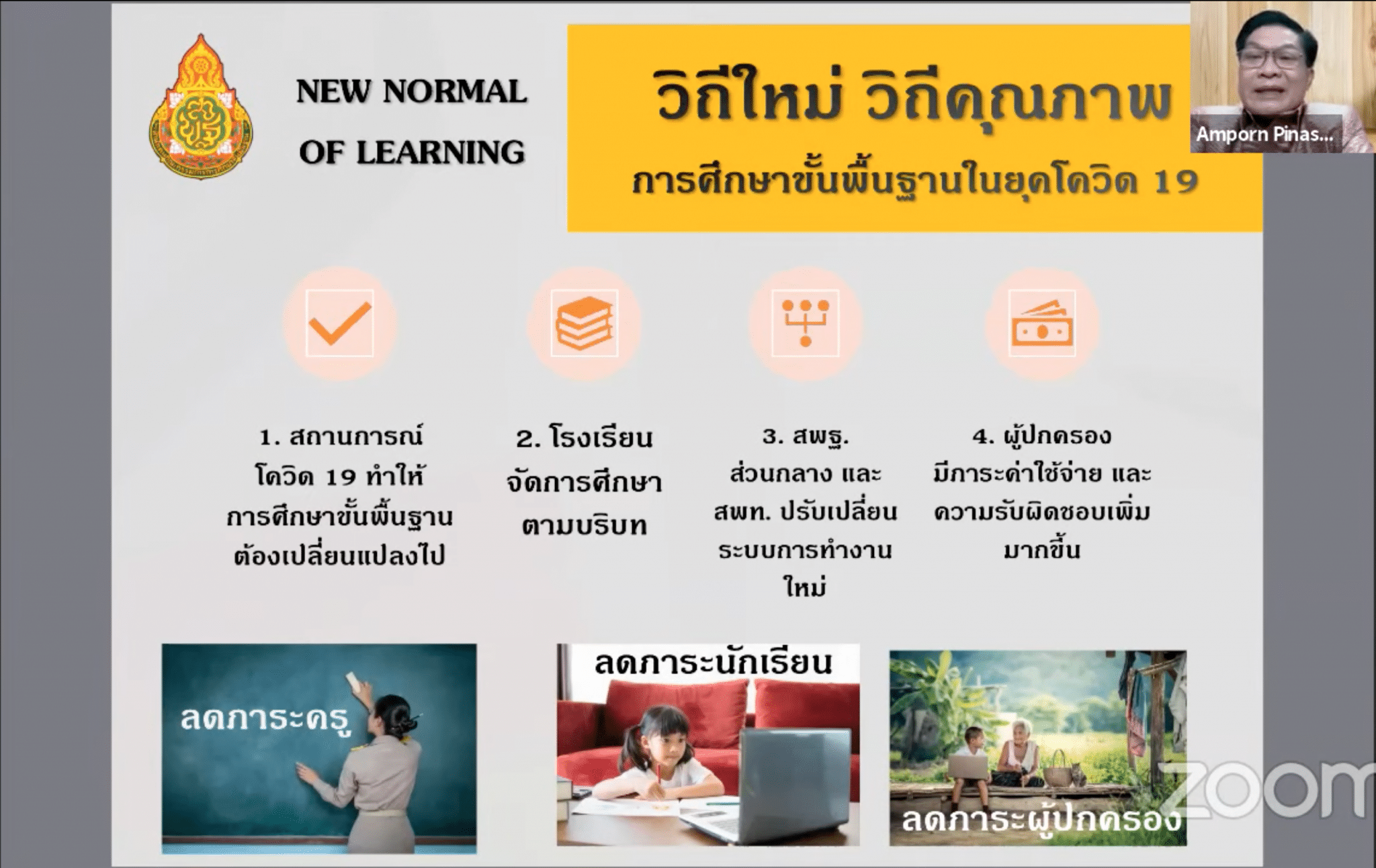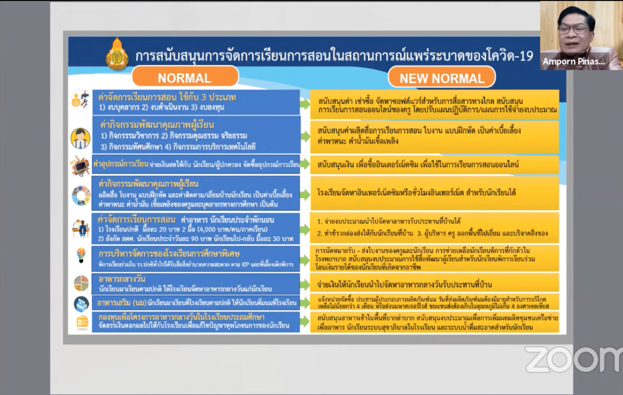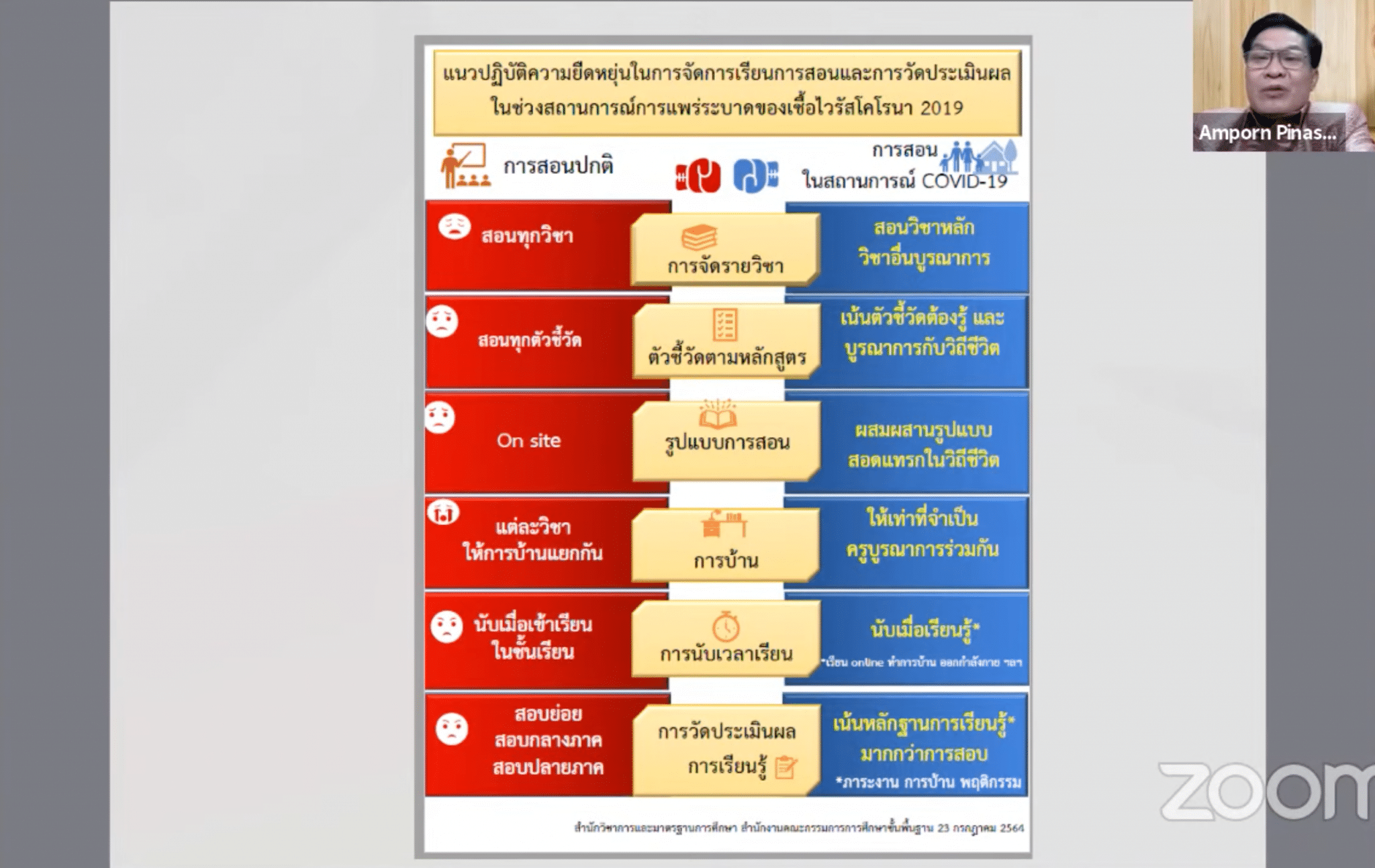 โดยนายอัมพร พินะสา ได้กล่าวถึงแนวปฏิบัติคสามยืดหยุ่นในการจัดการเรียนการสอน และวิธีการวัดประเมินผลในช่วงสถานการณโควิด-19 โดยเน้นการจัดการเรียนการสอนในตัวชี้วัดที่ต้องรู้ ไม่จำเป็นต้องสอนทุกตัวชี้วัด และบูรณาการสอนโดยสอดแทรกในวิถีชีวิตนักเรียน