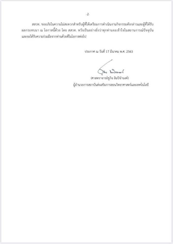 สสวท. จึงกําหนดให้เลื่อนการจัด “กิจกรรมการอบรมครู รอบครูผู้สอน ตั้งแต่วันที่ 26 มีนาคม ถึง 11 พฤษภาคม 2563 ด้วยระบบทางไกล ตามโครงการพัฒนานักเรียนอย่างมีคุณภาพด้วยการจัดประสบการณ์เรียนรู้ วิทยาศาสตร์ คณิตศาสตร์ เทคโนโลยี และสะเต็มศึกษา โดยบูรณาการกับหน่วยงาน 4 สังกัด” ออกไป อย่างไม่มีกําหนด และเมื่อสถานการณ์คลี่คลายแล้ว จะกําหนดจัดกิจกรรมนี้ในโอกาสต่อไป