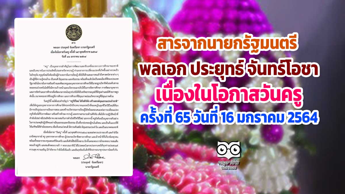 สารจากนายกรัฐมนตรี พลเอก ประยุทธ์ จันทร์โอชา เนื่องในโอกาสวันครู ครั้งที่ 65 พุทธศักราช 2564 วันที่ 16 มกราคม 2564 มีรายละเอียดดังนี้