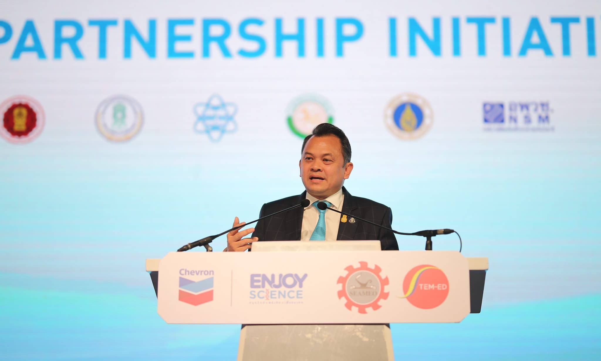 นายณัฏฐพล ทีปสุวรรณ รัฐมนตรีว่าการกระทรวงศึกษาธิการ และในฐานะสมาชิกองค์การรัฐมนตรีศึกษาแห่งเอเชียตะวันออกเฉียงใต้ (SEAMEO) กล่าวว่า ความร่วมมือจากทุกภาคีครั้งนี้ ถือเป็นการผนึกกำลังระหว่างหน่วยงานด้านการศึกษาและด้านการพัฒนาวิชาชีพกับภาคเอกชนในรูปแบบคลัสเตอร์เป็นครั้งแรก ซึ่งกล่าวได้ว่าเป็นสิ่งที่ดีและเกิดประโยชน์กับประเทศอย่างแท้จริง เพราะตอบโจทย์เทรนด์การศึกษาโลก ที่ต้องมีความยืดหยุ่น สามารถปรับเปลี่ยนให้เท่าทันสถานการณ์และบริบทโลก ดังนั้นด้วยเครือข่ายและองค์ความรู้ของศูนย์ SEAMEO STEM-ED และโครงการ Chevron Enjoy Science: สนุกวิทย์ พลังคิด เพื่ออนาคต ที่เข้ามาร่วมทำหน้าที่เป็นแกนกลางในการดำเนินงานภายใต้ความร่วมมือดังกล่าว เชื่อว่าจะสามารถช่วยเติมมุมมองและสนับสนุนการพัฒนาสะเต็มศึกษาไทยและร่วมกันต่อยอดในระดับภูมิภาค