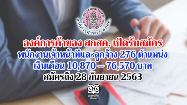 องค์การค้าของ สกสค. เปิดรับสมัครพนักงานเจ้าหน้าที่และลูกจ้าง 276 ตำแหน่ง เงินเดือน 10,870 – 76,570 บาท สมัครถึง 28 กันยายน 2563
