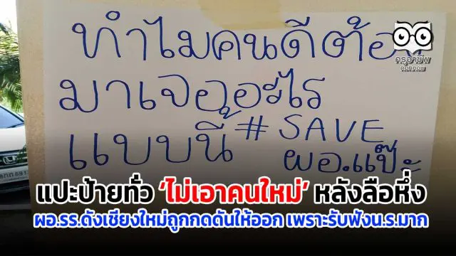 แปะป้ายทั่ว ‘ไม่เอาคนใหม่’ หลังลือหึ่ง ผอ.รร.ดังเชียงใหม่ถูกกดดันให้ออก เพราะรับฟังน.ร.มาก จากกรณี กระแสข่าว ผู้อำนวยการโรงเรียนดังในจ.เชียงใหม่ ถูกบีบให้ออกจากราชการ เนื่องจากรับฟังเด็กมากไป โดยให้เหตุผลในเอกสารว่า รับราชการนาน ทำให้เกิดกระแสวิพากษ์วิจารณ์ถึงกรณีดังกล่าว โดยเฉพาะกับนักเรียนที่ไม่พอใจกรณีดังกล่าว โดยหลายคนระบุว่า ผู้อำนวยการเป็นคนที่เหมาะสม