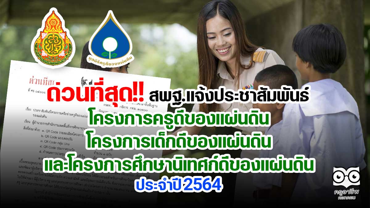 ด่วนที่สุด!! สพฐ.แจ้งประชาสัมพันธ์ โครงการครูดีของแผ่นดิน โครงการเด็กดีของแผ่นดิน และโครงการ ศึกษานิเทศก์ดีของแผ่นดิน ประจำปี 2564