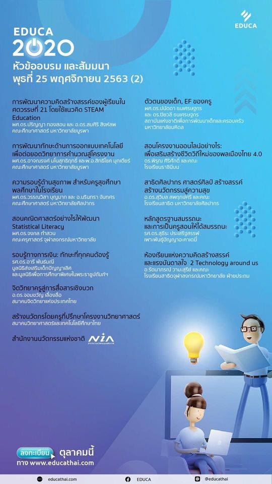 EDUCA 2020 รายชื่อหัวข้ออบรม และสัมมนาประจำวันที่ 25 และ 26 พฤศจิกายน 2563 ลงทะเบียนร่วมงานเพียงคนละ 100 บาท