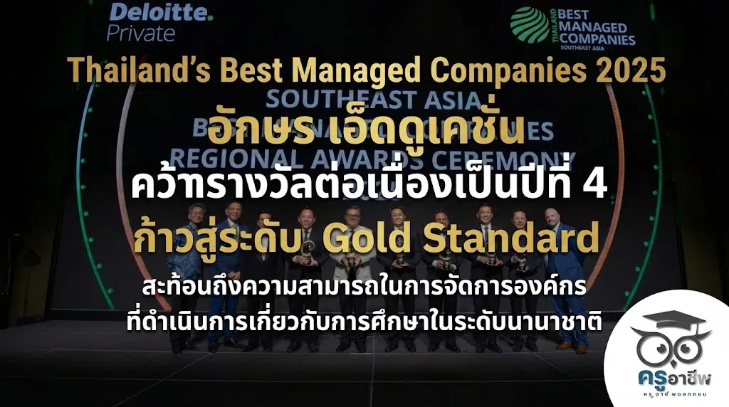 เมื่อวันที่ 19 พฤศจิกายน 2568 บริษัท อักษร เอ็ดดูเคชั่น จำกัด (มหาชน) ผู้นำนวัตกรรมด้านสื่อเพื่อ การศึกษาของไทย ได้รับเชิญให้ เข้าร่วมงาน “2025 Southeast Asia Best Managed Companies Regional Awards Ceremony” ซึ่งจัดขึ้น ณ กรุงกัวลาลัมเปอร์ ประเทศมาเลเซีย เพื่อประกาศความ ภาคภูมิใจอีกครั้ง หลังได้รับการยกย่องจาก Deloitte Private ให้เป็นหนึ่งในองค์กรที่มี การบริหารจัดการยอดเยี่ยมที่สุดของประเทศไทย ซึ่งได้รับรางวัล Thailand’s Best Managed Companies 2025 ต่อเนื่องเป็นปีที่ 4 และก้าวสู่สถานะสูงสุด “Gold Standard” สะท้อนถึงความสามารถในการจัดการองค์กรที่ดำเนินการเกี่ยวกับการศึกษาในระดับนานาชาติ