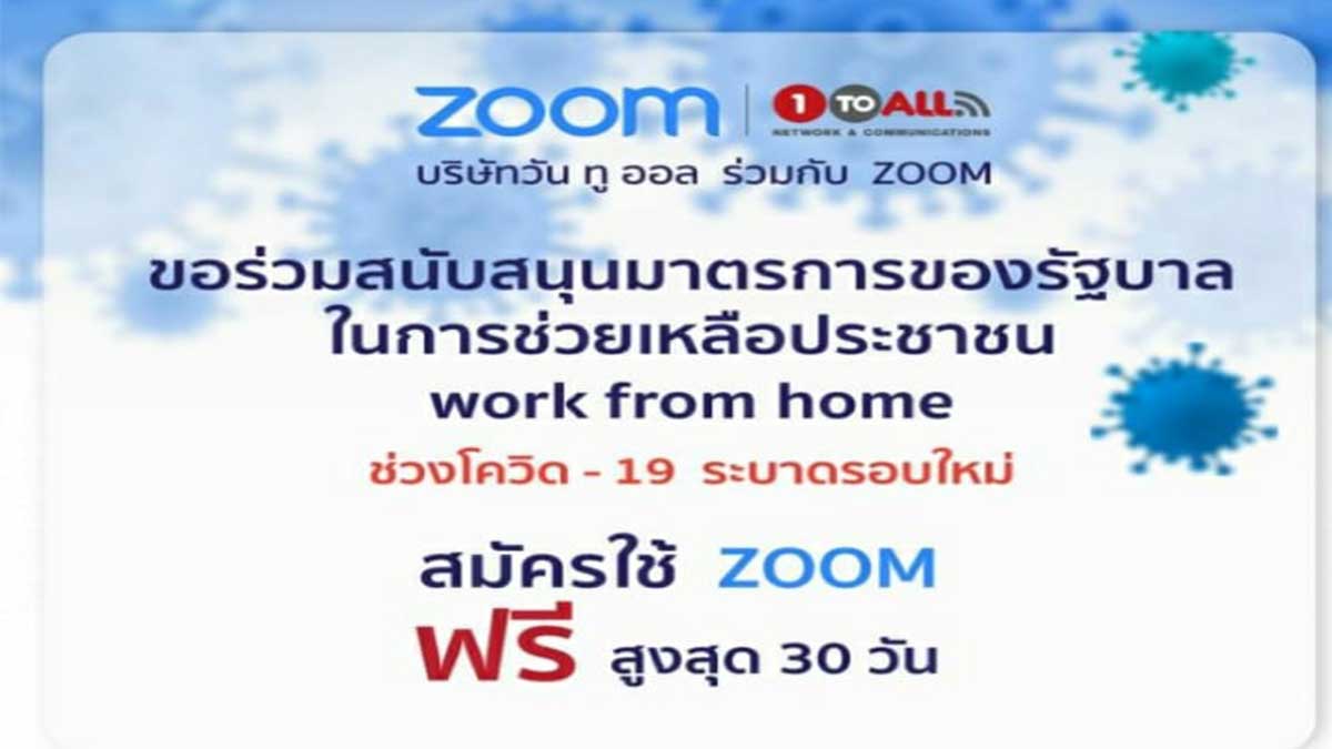 Zoom Thailand สนับสนุน work from home สมัครรับสิทธิการใช้ งาน Zoom ฟรี นานสูงสุด 30 วัน การแพร่ระบาดของโรค COVID-19 ทั่วโลก ทำให้กระแสการทำงานจากที่บ้าน work from home ถูกนำมาใช้งานมากขึ้น