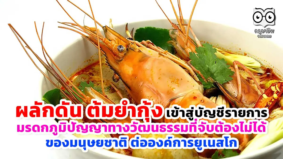 นายชาย นครชัย อธิบดีกรมส่งเสริมวัฒนธรรม กล่าวว่า ตามที่ กรมส่งเสริมวัฒนธรรม(สวธ.) กระทรวงวัฒนธรรม (วธ.) ได้ผลักดัน ต้มยำกุ้ง เข้าสู่บัญชีรายการมรดกภูมิปัญญาทางวัฒนธรรมที่จับต้องไม่ได้ของมนุษยชาติต่อองค์การยูเนสโก ต่อจาก “โขน” และ “นวดไทย” ล่าสุด ได้มีการประชุมประชาพิจารณ์ เพื่อรับฟังความคิดเห็นและข้อเสนอแนะทั้งทางตรงและทางอ้อม จากภาคส่วนที่เกี่ยวข้อง ทั้งชุมชนผู้ถือครองภูมิปัญญา ผู้ปฏิบัติ และผู้สืบทอด ตลอดจนผู้มีส่วนได้ส่วนเสีย ผู้ประกอบการ บริษัทผลิตอาหาร ร้านอาหาร เพื่อให้ได้รับรู้รับทราบ ยินยอม และเข้ามามีส่วนร่วมในการจัดทำข้อมูล เอกสาร นำเสนอ ต่อที่ประชุมคณะกรรมการ ส่งเสริมและรักษามรดกภูมิปัญญาทางวัฒนธรรม พิจารณา ระหว่างเดือน พ.ย.-ธ.ค. นี้ จากนั้นจะนำเสนอต่อไปยังที่ประชุมคณะกรรมการร่วมระหว่างรัฐบาลเพื่อการสงวนรักษามรดกวัฒนธรรมที่จับต้องไม่ได้ของยูเนสโก ภายในเดือนมี.ค. 2564