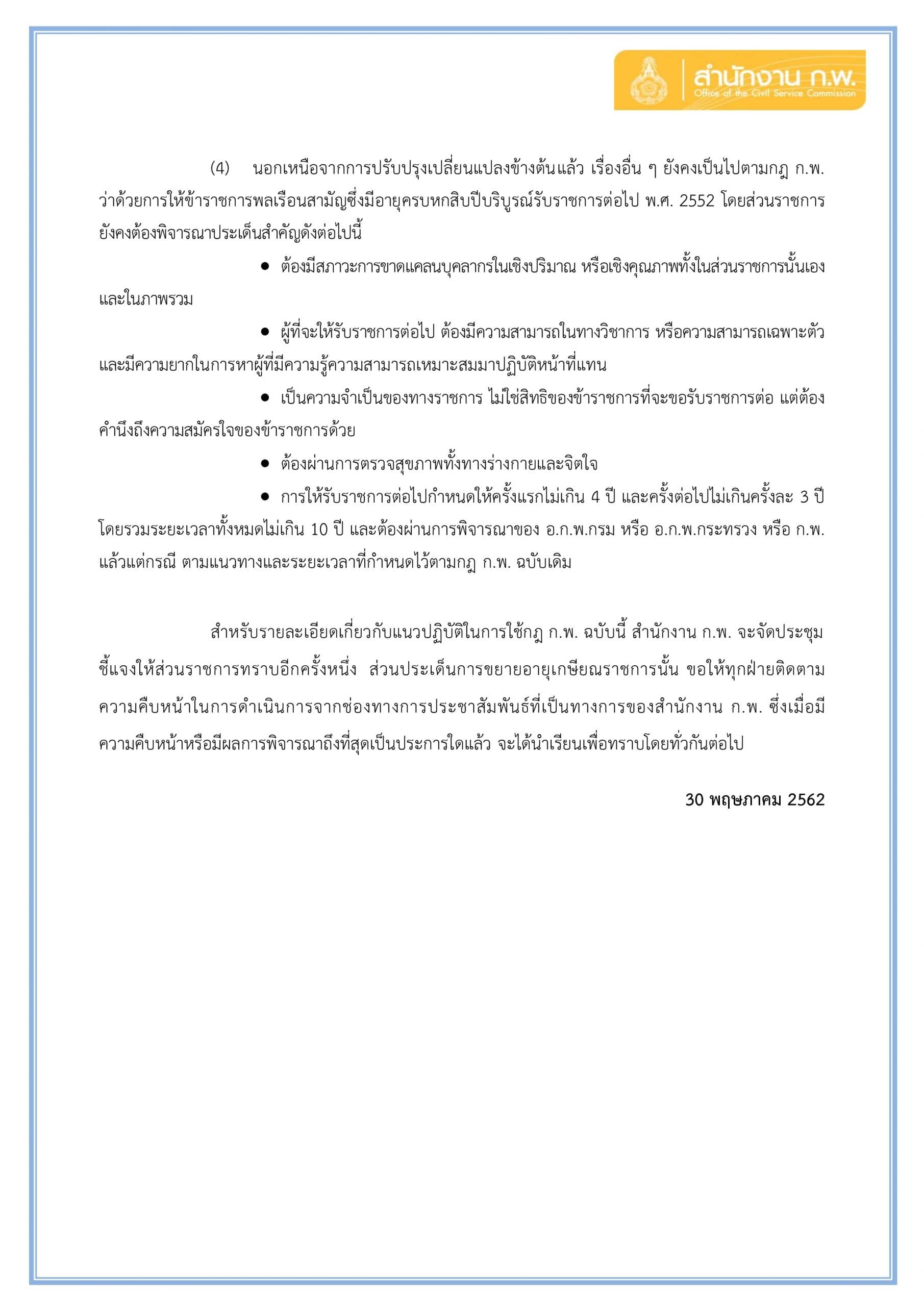 สํานักงาน ก.พ. ได้ศึกษาแนวทางการขยายเกษียณจากราชการมาระยะเวลาหนึ่งแล้ว โดยกําหนดสาระ สําคัญให้การขยายหรือปรับปรุงอายุเกษียณและการขยายอายุราชการทํางานเป็นมาตรการเพื่อรองรับ สังคมสูงอายุ รวมถึงสนับสนุนให้บุคลากรภาครัฐทํางานหรือมีอาชีพหลังเกษียณ และการบริหารกําลังคน ภาครัฐในช่วงวัยต่าง ๆ อย่างเหมาะสม