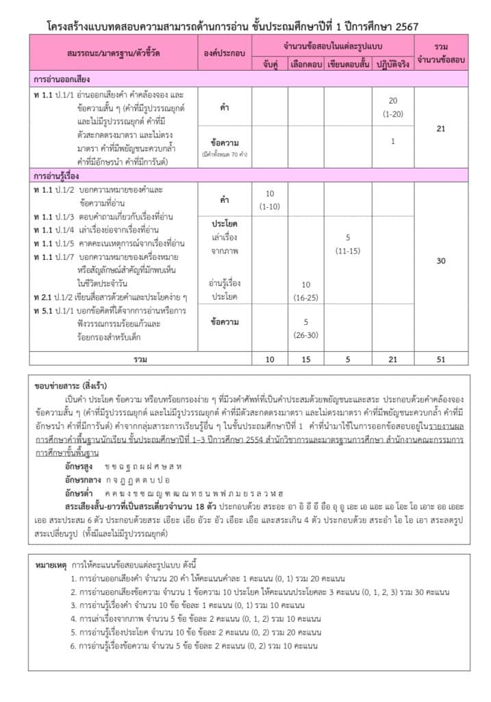 โครงสร้างแบบทดสอบการประเมินความสามารถด้านการอ่าน (RT) ชั้นประถมศึกษาปีที่1