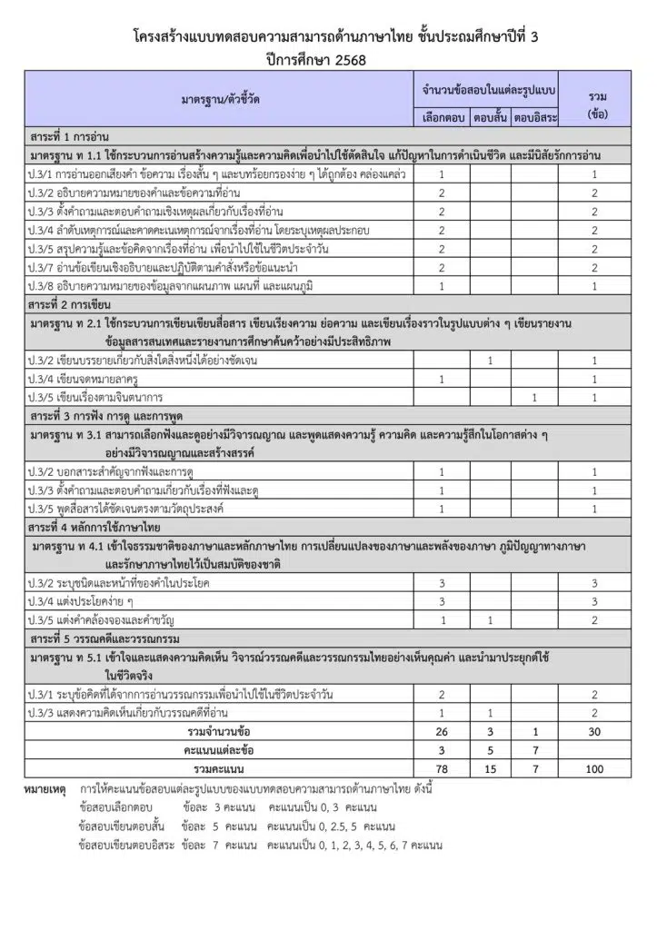 โครงสร้างแบบทดสอบความสามารถด้านภาษาไทย ชั้นประถมศึกษาปีที่ 3 ปีการศึกษา 2568