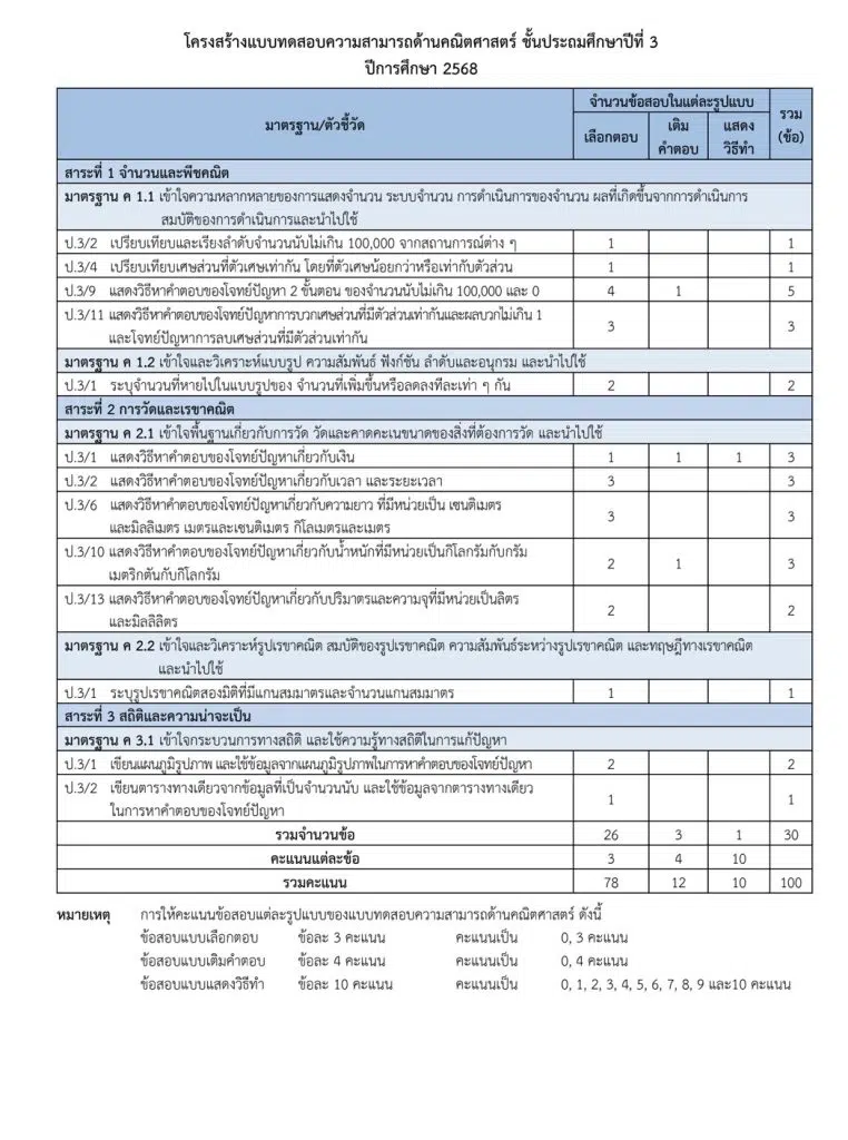 โครงสร้างแบบทดสอบความสามารถพื้นฐานด้านคณิตศาสตร์ ชั้นประถมศึกษาปีที่ 3 ปีการศึกษา 2568
